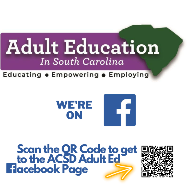 ACSD Adult Ed now has a Facebook page. To get to it, scan the QR code in the post or search for Abbeville County Adult Education on Facebook. You can also click on this direct link. Share/Follow our page to get the most accurate and updated information about our Adult Education program!